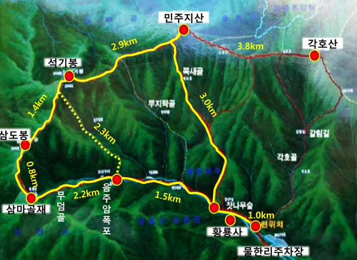 휴양림에서 시작하여 각호산, 삼도봉, 석기봉 등 다양한 트레킹 코스가 연결돼있으며, 원시림과 너른 숲길이 인상적입니다.